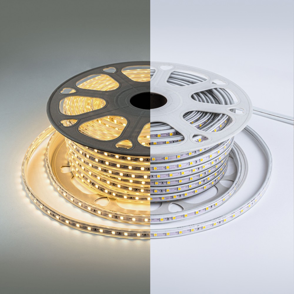 Герметичная IP65 лента, светодиоды smd 5050, 60шт/м. Цвет белый 4500K. Питание 220V, мощность 14.4Вт/м, световой поток 900Лм/м, угол 120°, высокая цветопередача CRI>90. Диапазон рабочих температур: -25…+50C⁰. Размеры 12.5×6мм. Мин.отрезок 1000мм. Шаг резки 5см. Пакет 50м. Цена за 1м.